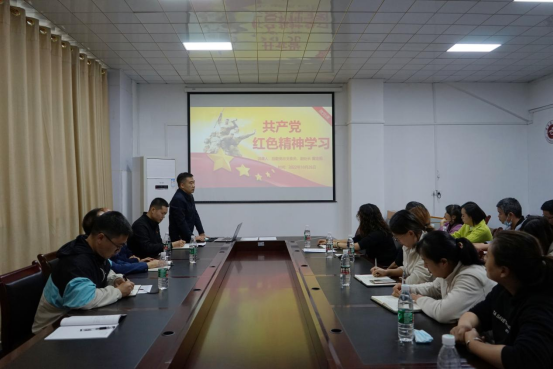 后勤党总支委员、副处长黄定旭作题为《共产党红色精神学习》专题党课,他详细阐述了长征精神、井冈山精神、抗战精神、遵义会议精神、延安精神、西柏坡精神、沂蒙精神七个精神内涵。