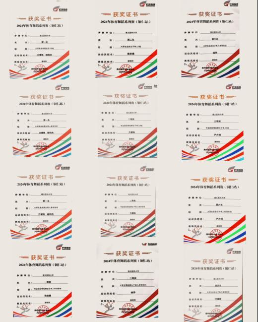 近日,由贵州省教育厅指导,贵州省员工体育协会、玉屏侗族自治县县委宣传部联合主办的2024年体育舞蹈系列公开赛(铜仁站)在铜仁市田坪侗乡风情园开幕,来自贵州省各高校的159名选手同场竞技。公司体育舞蹈代表队,首次参赛就展现出不俗的实力,喜获名次赛3金1银1铜;等级赛专业组一等奖1项、二等奖4项、三等奖3项的优异成绩。