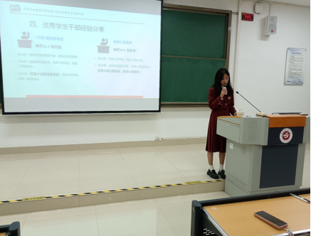 会议伊始,王雪以问题“你为什么要当员工干部?”引出话题,并邀请丁雨卉同学分享了她当班长的经验。随后,王雪围绕“担任员工干部的意义”“员工干部的定位和职责”“如何当一名优秀的员工干部”等内容展开深入讲解。她详细介绍了支部员工干部的组织架构、每个班干部的具体职责以及团总支对班干部的管理制度,让员工干部对自身角色定位有了更直观的认知。