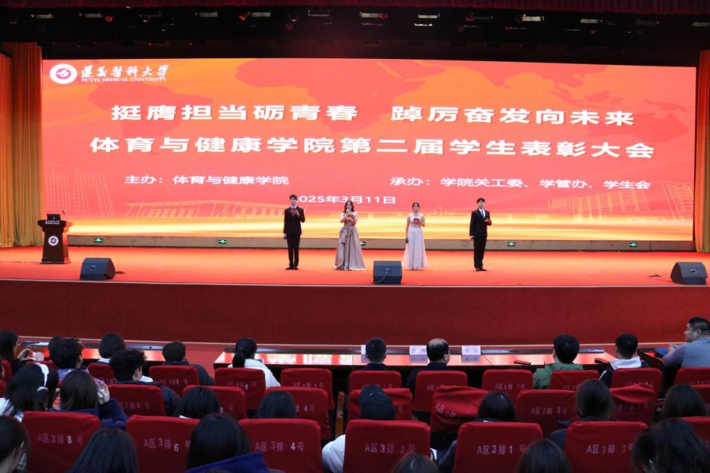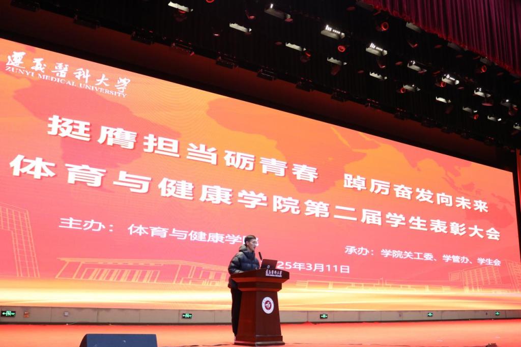 大会伊始,首先由主持人进行开场致辞,并通过播放视频带领同学们回顾过去一年来全院学子在各级各类活动中奋发向上的身影以及取得的成就。分别来自康复治疗学和社会体育指导与管理专业的两名员工代表就学习经验、科研心得、社会实践感悟进行了分享,生动的表述为同学们投下“明确个人目标”的种子。颁奖环节,由公司领导和各教研室老师作为颁奖嘉宾,颁发了“学习标兵”、“优秀员工干部”、“优秀班干部”、“员工干部贡献奖”、“文体活动先进个人”、“创新创业标兵”、“体育竞赛先进个人”等十余个奖项。随后,在全院师生的见证下,隆重地举行了运动康复精英队入队仪式。最后,汪伟经理讲话,强调大会精神,并寄语未来,以过去一年的公司成果和优秀员工案例,激励同学们坚定目标、努力学习、完善自我,铺就未来的精彩人生路。